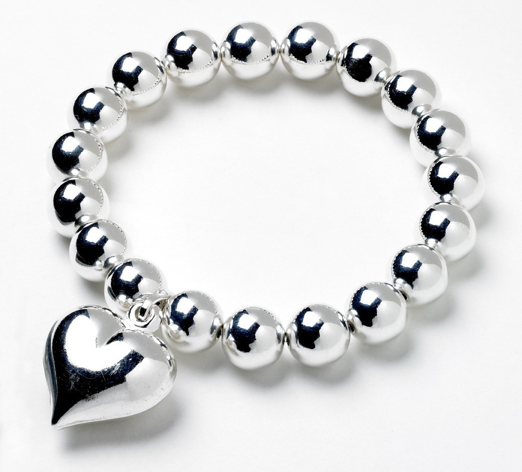Handmade using Sterling Silver 10mm beads and a 20mm sterling Silver puffy hollow heart.