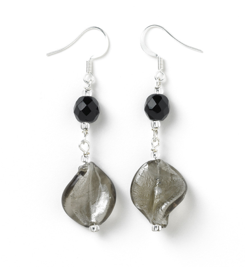 Handmade using a smokey brown silver-lined glass twist bead at the bottom and an 8mm facted black glass bead at the top