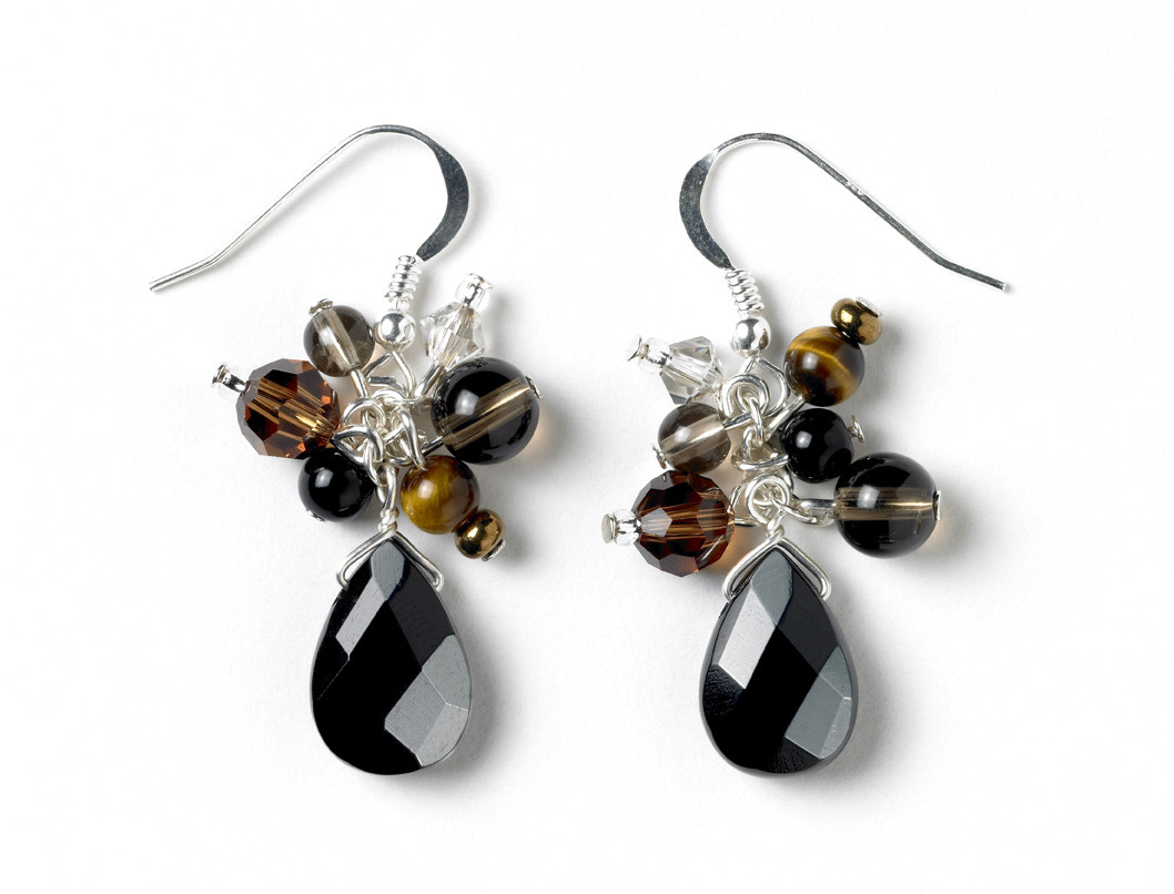 Handmade using black onyx, smokey quartz, tigers eye and swarovski crystal glass beads on Sterling Silver earring hooks
