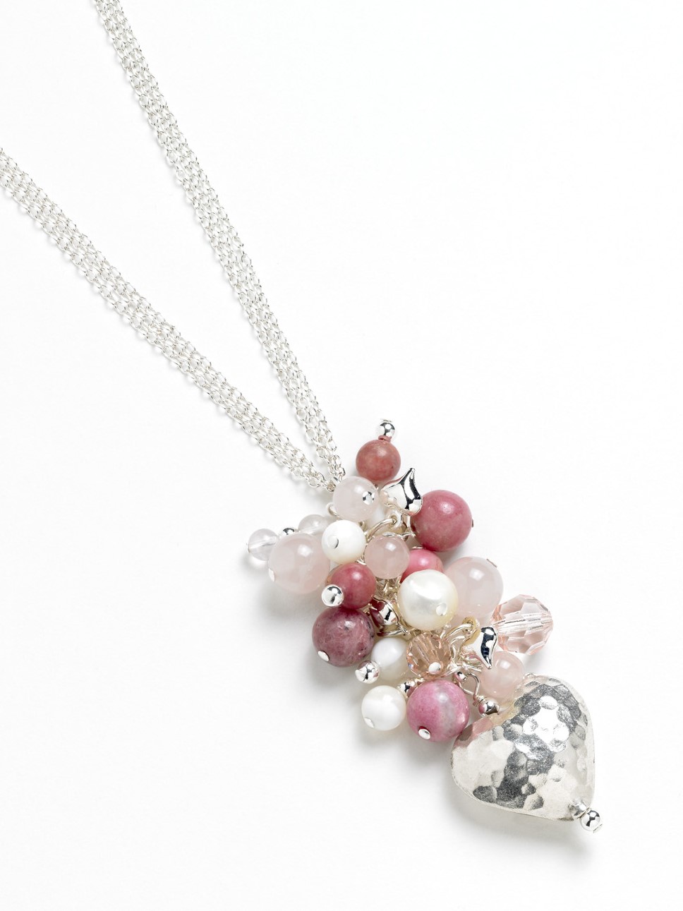 CN0056 Large Charm Necklace Pink Handmade using rose quartz, faceted glass and rhodonite semi-precious beads This necklace is fitted with a sterling silver snake chain (not the triple chain as shown)