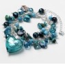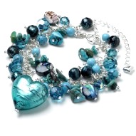 CN0083 Large Charm Necklace- Turquoise Handmade using turquoise, faceted glass, swarovski crystal, freshwater pearls and abalone shell beads. On the bottom is a turquoise genuine murano heart. This necklace is on a 16 inch/40.5cm turquoise satin cord with a sterling silver extender chain and catch. £35.00
